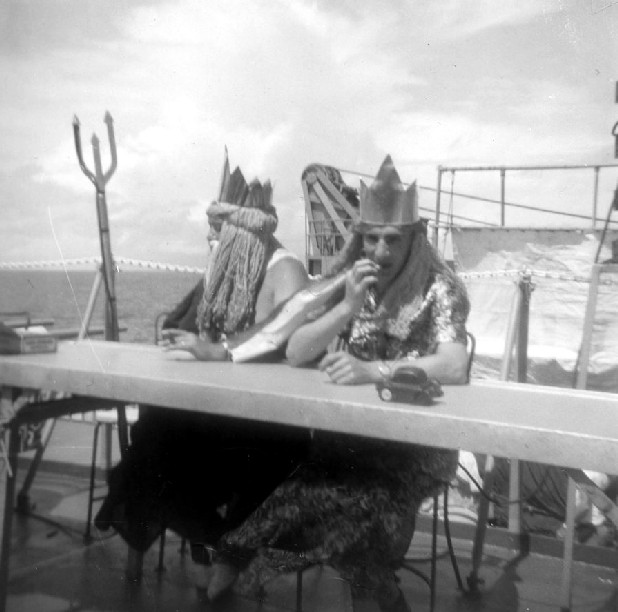 The following pictures were submitted by Arvell Cuffey, YN3, Lanham, MD. Pictures taken on Artic Cruise to Greenland in July 1957. Shipmates working on Artic Cruise. Carribean Cruise 1957: Ben Logan, Arvell Cuffey, Ed Wiseman and Larry Mahoney. J.D. Norris, Ed. Bixler and Larry Mahoney. Arvell Cuffey receiving promotion to YN3 in 1958. Presidential Cruise enroute to So America, crossing the Equator, Feb. 1960: King Neptune and Queen of the Sea, dressed for the initiation crossing the equator. Shipmate being executed during the initiation. Shipmates lined up during the initiation. Queen of the Sea! Arvell Cuffey, YN3 on the "Rock" for his last time - 5/60