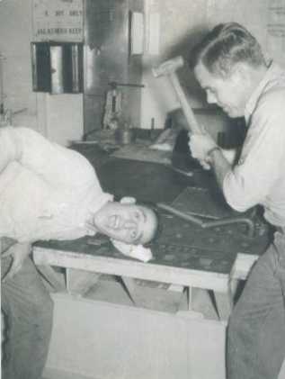 The following pictures were submitted by Bill Sims, DC3, Glendale, OH Launching of a weather balloon from the flight deck on the Artic Cruise in 1957. R Division officer C. F. Axtell, preparing to check the screws after we hit an iceberg on the Artic Cruise in 1957. Mr. Brown and Mr. DeFranco fooling around in the metal shop. Bill Sims in the Carpenter Shop.
