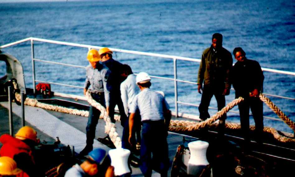 The following pictures were sent to us by Bill Hamilton, EN2 of Sealy, TX. The pictures were taken in 1978. Gus the Gunners Mate shooting at a target being pulled by another ship. They shot those guns all day from 06:00 til 18:00, and the rust was falling all over everything. Loading up at Morehead City before the ship left on a Med. Cruise. Took three days to load all the trucks, tanks, LCU's, ACP's etc. Chopper mail call in the middle of the Med from the USS Nimitz. The A Gang 1977-78. Larry Larmeu at drum level watch #2 Engine Room on Med Cruise in 1978. Throttle board, #2 Engine Room. Refueling minesweepers in the North Atlantic in 1978.