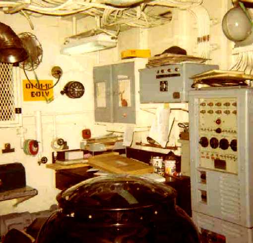 Room looking towards entrance with main switchboard left, MK-14 gyro compass center